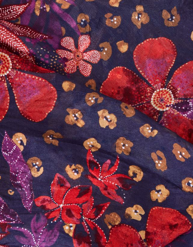وشاح للتوقعات المشمسة. هذا الوشاح، المنغمس في لوحة عميقة من الزهور الساحرة، يضفي اللون والطباعة على الملابس. مصمم بنسبة 100% من الحرير خفيف الوزن وناعم بشكل فاخر.