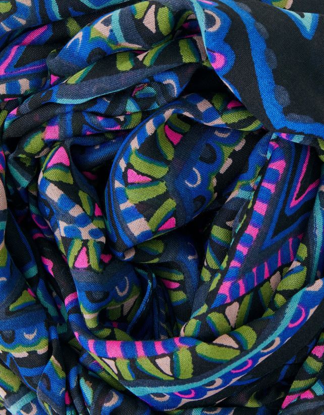 بين الفصول ؟ لدينا هذا الوشاح خفيف الوزن مزين بتصميم نجمة نابضة بالحياة على خلفية باللون الأزرق الكوبالت، وهو مصمم لإضفاء البهجة على ملابسك في الخريف والربيع.