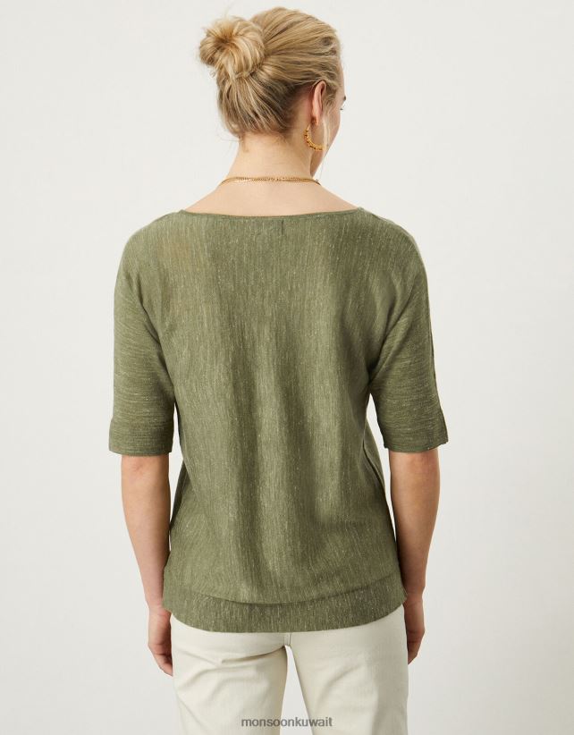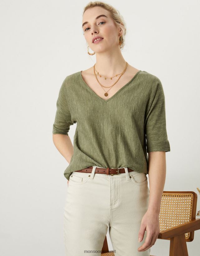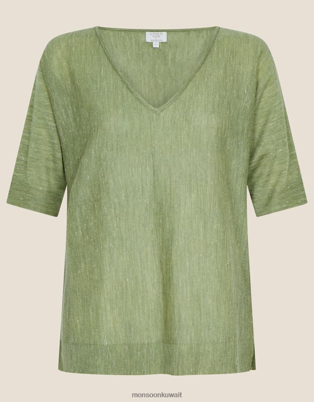 Monsoon Kuwait - تي شيرت برقبة على شكل حرف V مصنوع من مزيج الكتان ملابس الأخضر (الكاكي) Monsoon نحيف N4BV8X1072