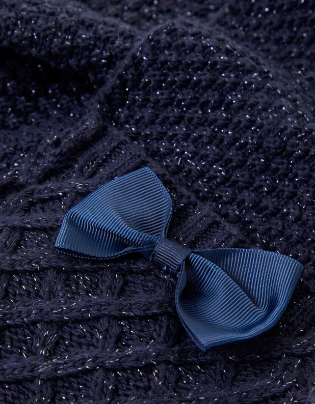 يحافظ على دفء الأطفال الصغار خلال الأيام الثلجية، هذا الوشاح مصنوع من نسيج سميك ونسيج كحلي معاد تدويره. تم نسجها من خلال ومضات صغيرة من الخيوط المعدنية للتألق، مع أقواس من الترتر في كل طرف.