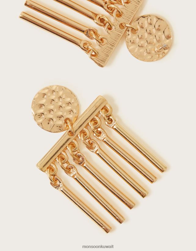 شرابات أسطوانية صغيرة تتدلى من مسمار معدني لتكوين مجموعة منظمة من الأقراط بلمسة بوهيمية رقيقة، مصنوعة من معدن ذهبي اللون. غير قابلة للاسترداد.
