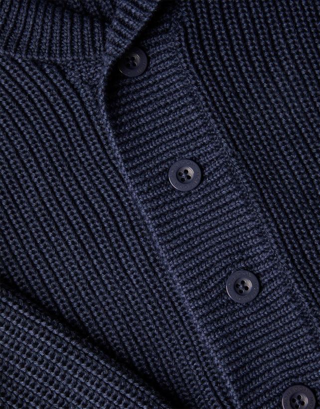 أنيقة ولكن غير رسمية، أين سيرتدونها في نهاية هذا الأسبوع؟ النسيج المريح يصنع هذه السترة المنسوجة بلمسة نهائية بحرية. تم تشطيبه بياقة شال مطوية يمكن فك أزرارها للحصول على خط عنق أكثر استرخاءً. اللون الأزرق