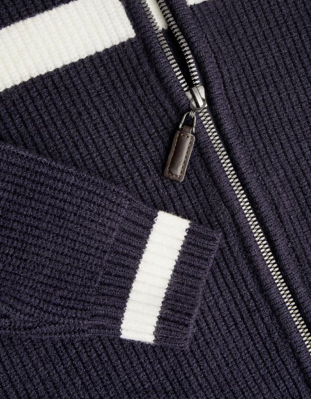 الملابس المسموحة هي السمارت كاجوال. هذه السترة المحبوكة مثالية للمناسبات اليومية. مصمم من نسيج ناعم، ويتميز بألوان متباينة وخطوط مع رقبة عالية للدفء. أزرق