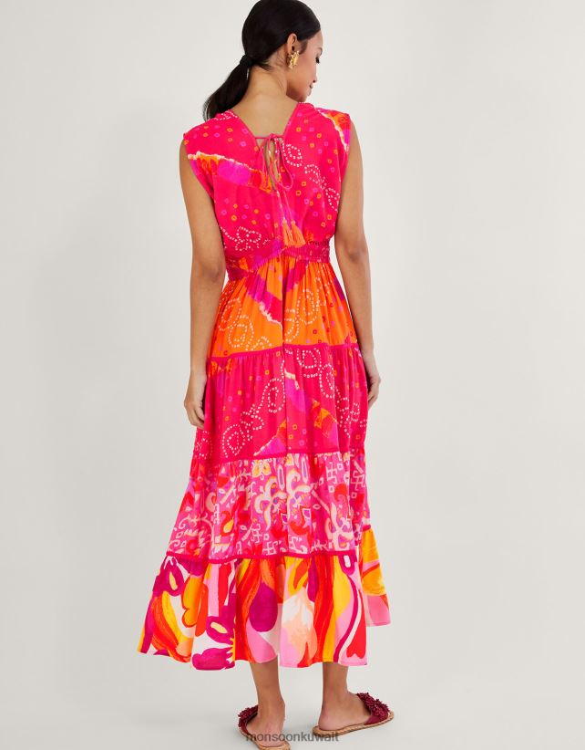 Monsoon معنى - فستان بانداني متوسط الطول بطبعة متباينة من لينزينج إيكوفيرو ملابس أحمر Monsoon نحيف N4BV8X779