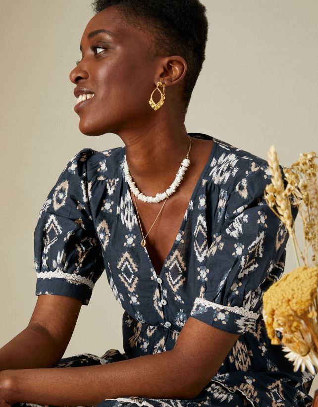 Monsoon UAE - فستان متوسط الطول بطبعة Ikat وأزرار على شكل حرف V من القطن المستدام ملابس الأزرق الداكن) Monsoon نحيف N4BV8X1121
