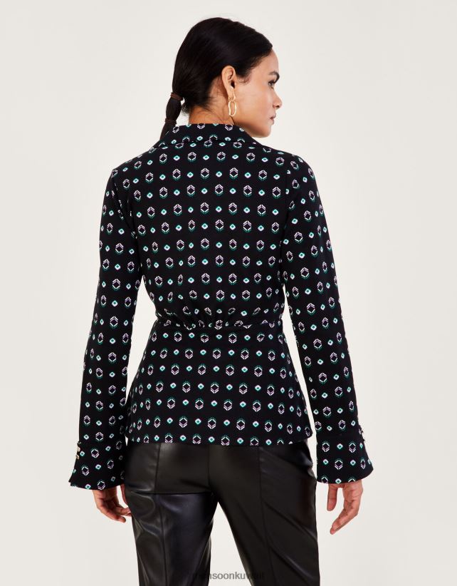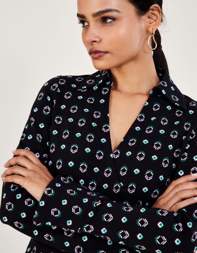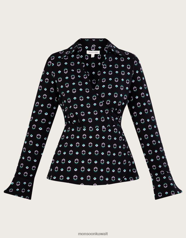 قميص جيرسي ملتف بطبعات هندسية ومكشكش من القطن المستدام ملابس أسود Monsoon نحيف N4BV8X749 - Monsoon children
