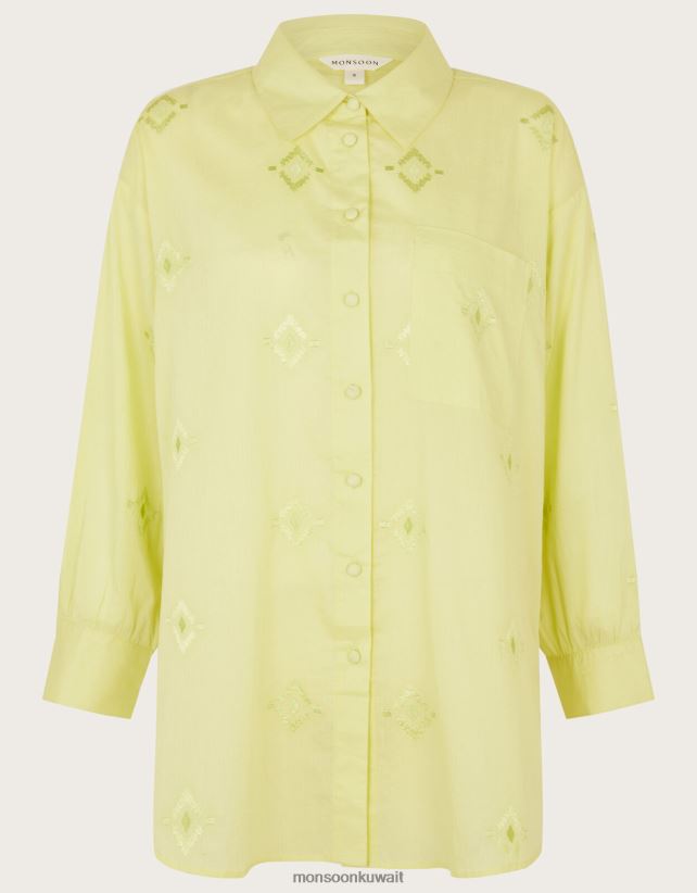 احصل على البهجة باللون الليموني، هذا القميص متعدد الاستخدامات يتميز بصورة ظلية مريحة، وزر من خلال التثبيت وياقة منظمة. ألق نظرة فاحصة واعثر على قطع الماس المستوحاة من الأزتيك في جميع أنحاء القطعة. أخضر