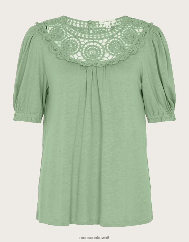 التي شيرت اليومي الخاص بك ولكن مع لمسة متجددة الهواء. تم تصميم هذا القميص المريح من مزيج الكتان المسامي، ويتميز بتفاصيل كروشيه مذهلة على طول خط العنق. تم تشطيبه بتفاصيل مكشكشة على الأكمام، ارتديه مع بنطال الجينز الأكثر راحة لديك ونسقيه مع الأحذية ذات الكعب العالي للحصول على خيار سريع للارتداء. أخضر