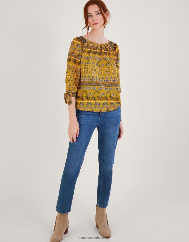 Monsoon محل - قميص جيرسي سموك بطبعة أوراق شجر على كامل التصميم ملابس المغرة الصفراء) Monsoon نحيف N4BV8X566