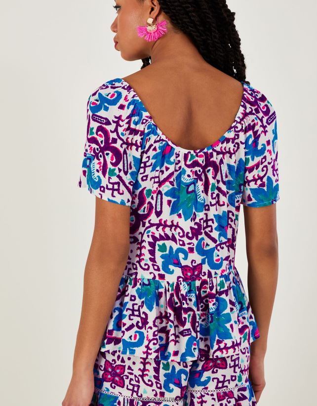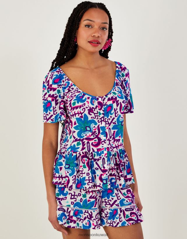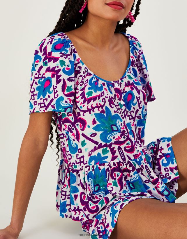 Monsoon معنى - بلوزة بأكمام قصيرة وطبعة زهرة النار من تصميم Lenzing Ecovero ملابس أزرق Monsoon نحيف N4BV8X591