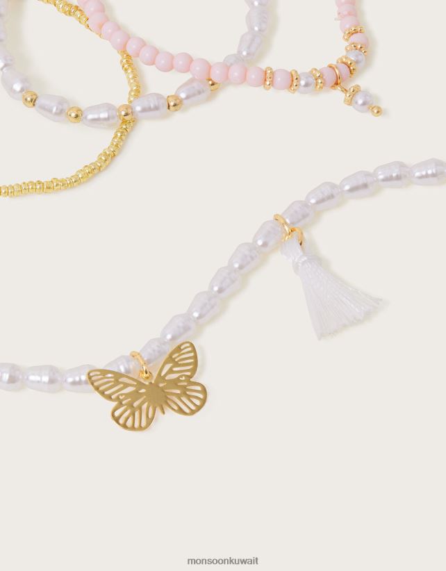 ألبسي أطفالك الصغار خرزات ذهبية لؤلؤية ووردية ولامعة عندما يتعلق الأمر بهذه المجموعة. تتميز بثلاثة أساور مطرزة وقلادة متناسقة، مع خمس قطع مستوحاة من البوهو بما في ذلك كل شيء بدءًا من شرابات القماش إلى الفراشات.